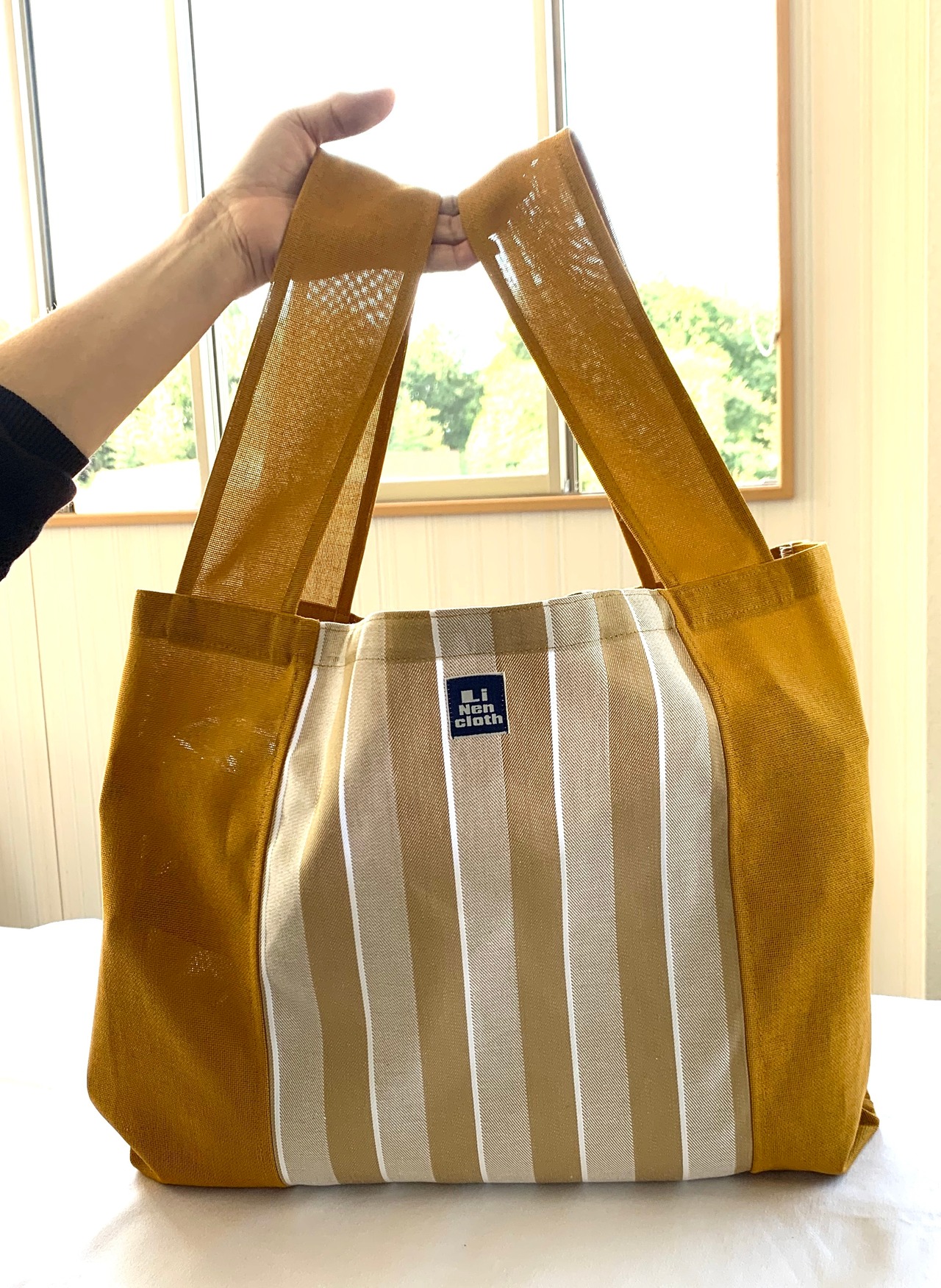 エコバック ストライプベージュ 両サイドにマスタード^ - ^