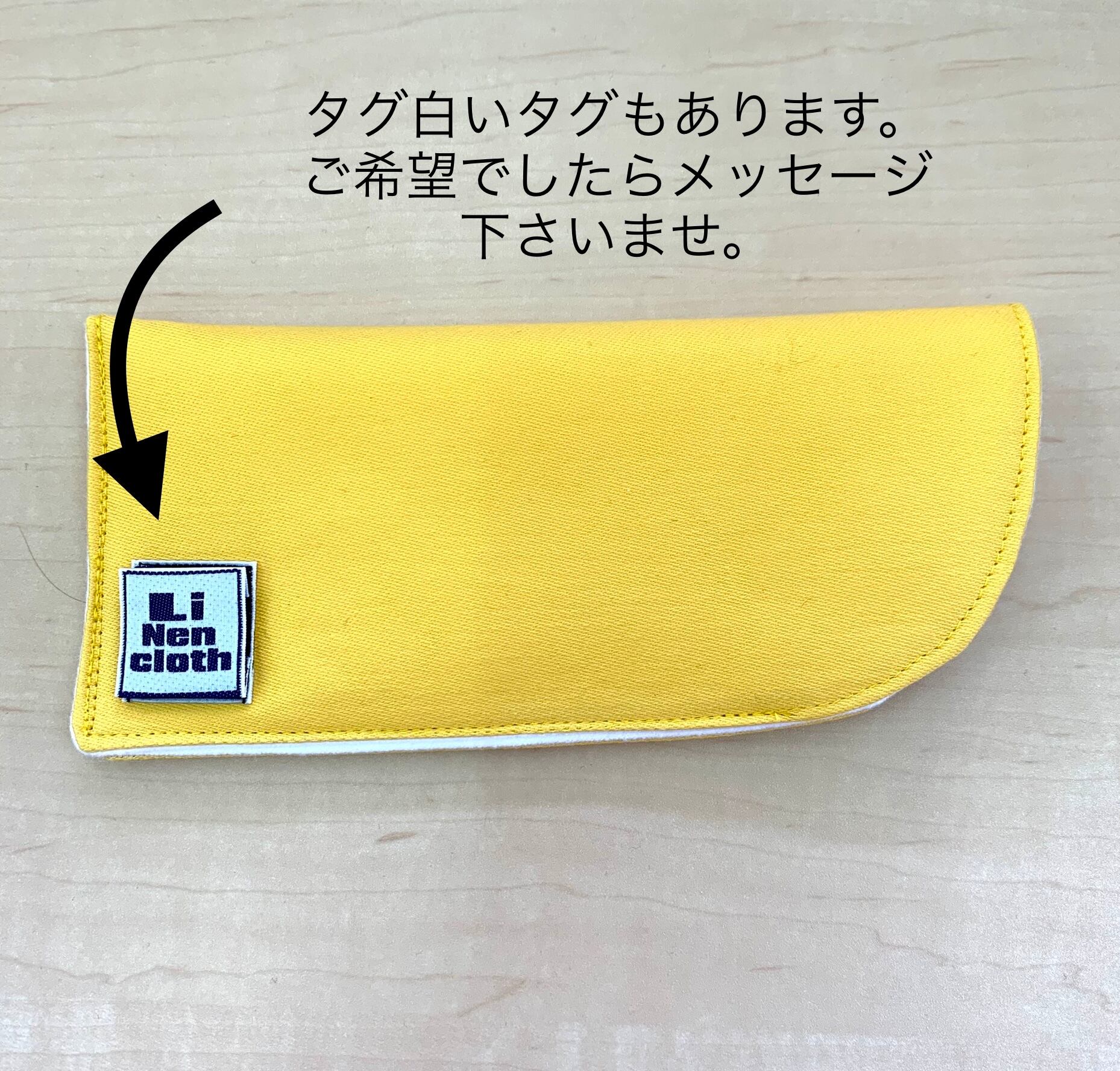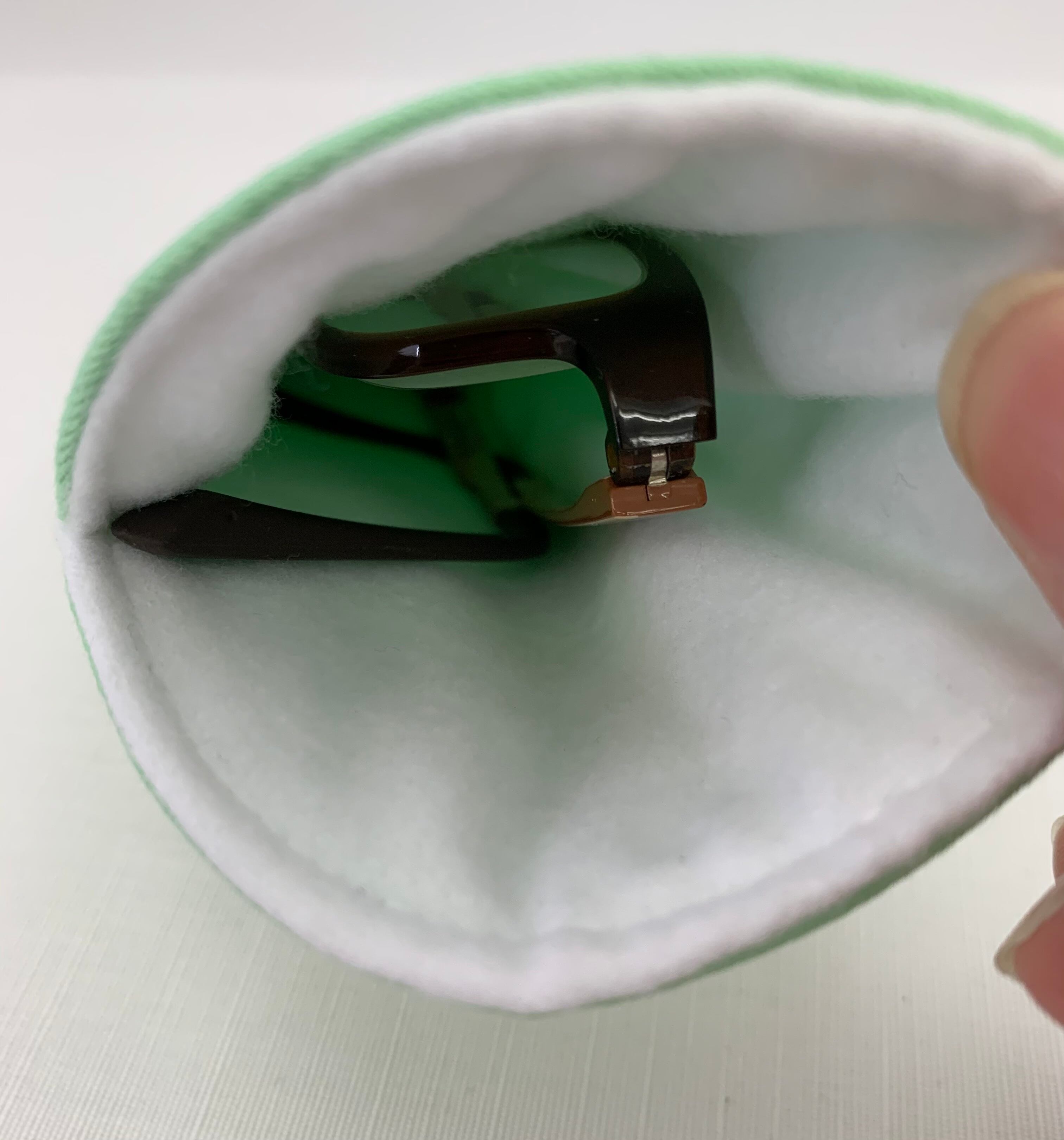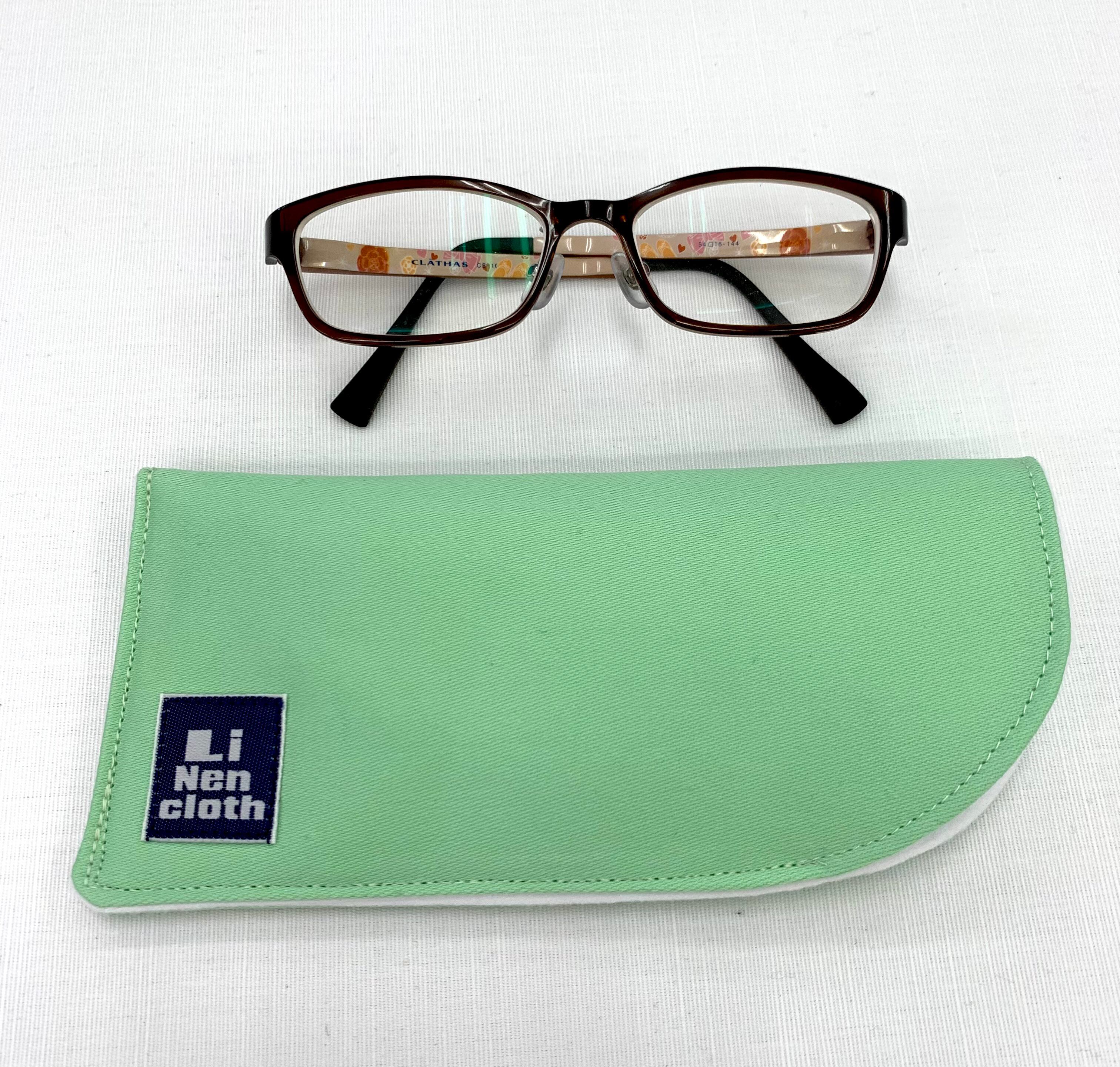 表生地に普通厚の接着芯を貼って張りを出しています。裏生地は白いネル生地を使用していますので、メガネのレンズに優しいです。間にキルト芯も使っています。