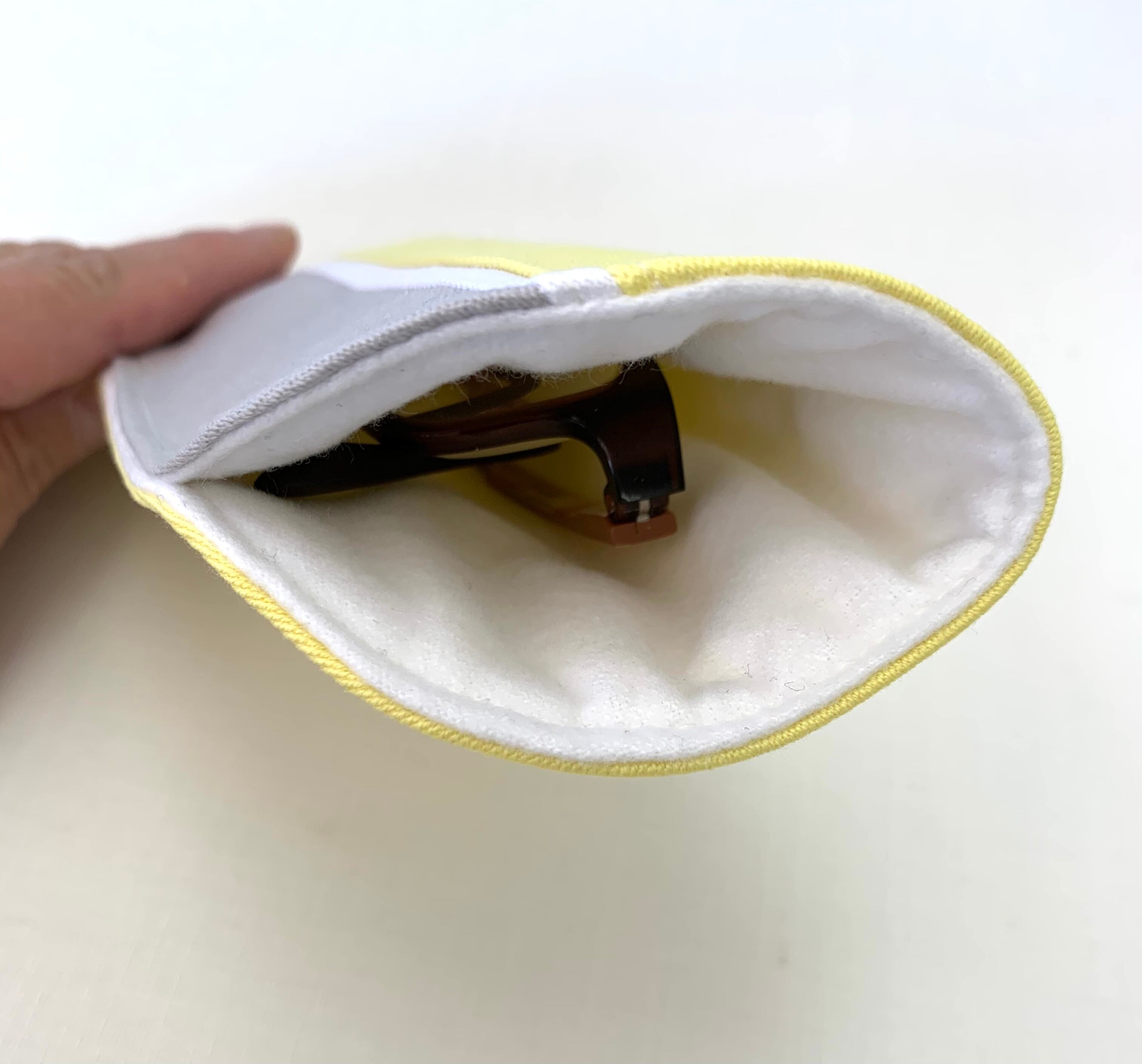 表生地に普通厚の接着芯を貼って張りを出しています。裏生地は白いネル生地を使用していますので、メガネのレンズに優しいです。間にキルト芯も使っています。