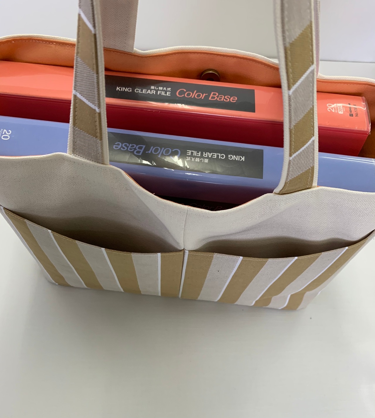 トートバッグの外側ストライプ柄のポケットを全面に付けました。