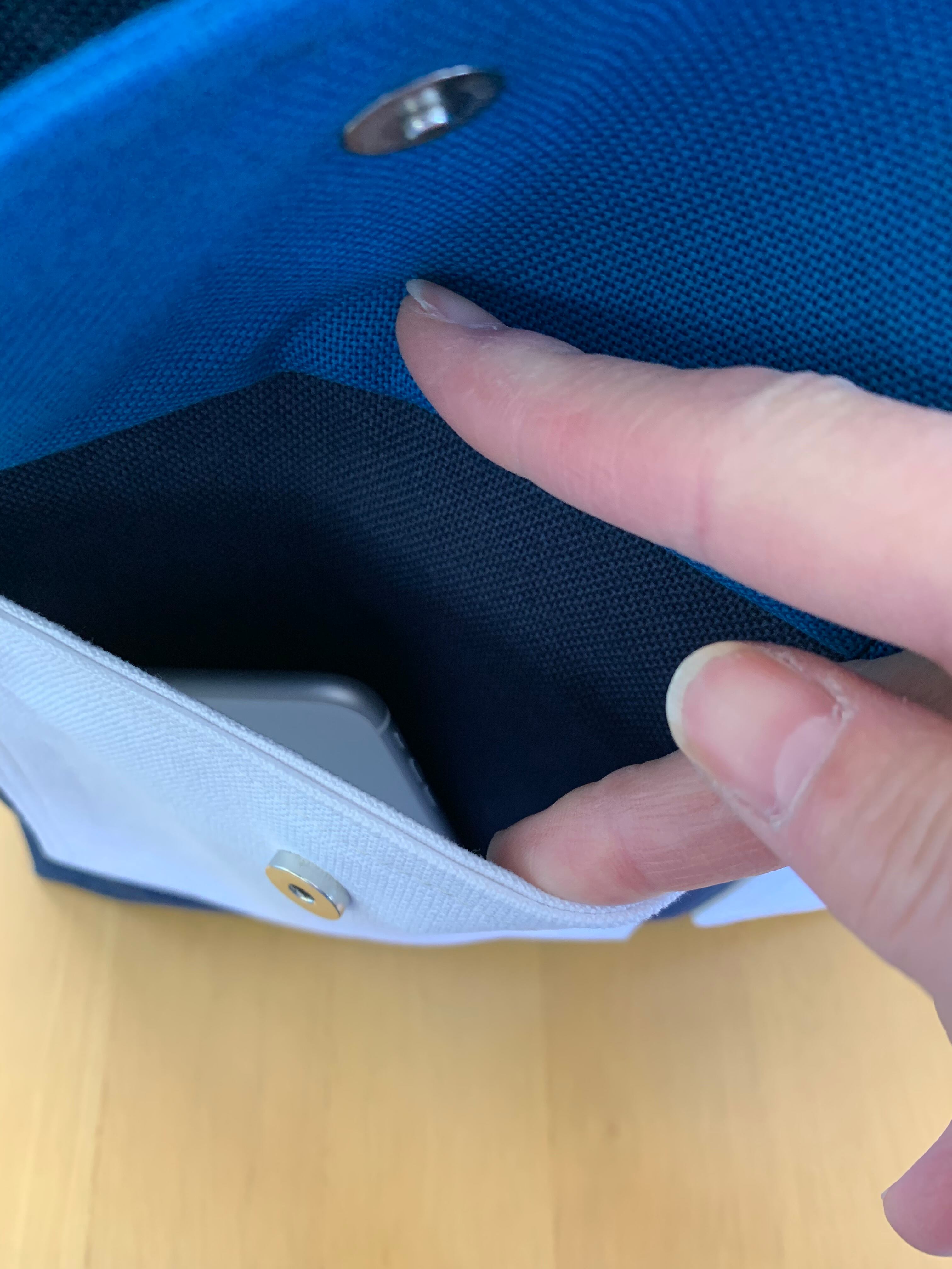 表側のV LINEのデザインは いろんな装いに合わせて使って下さい。裏側ポケットのデザインはカジュアルな装いに合う、ポップな感じで可愛い。
