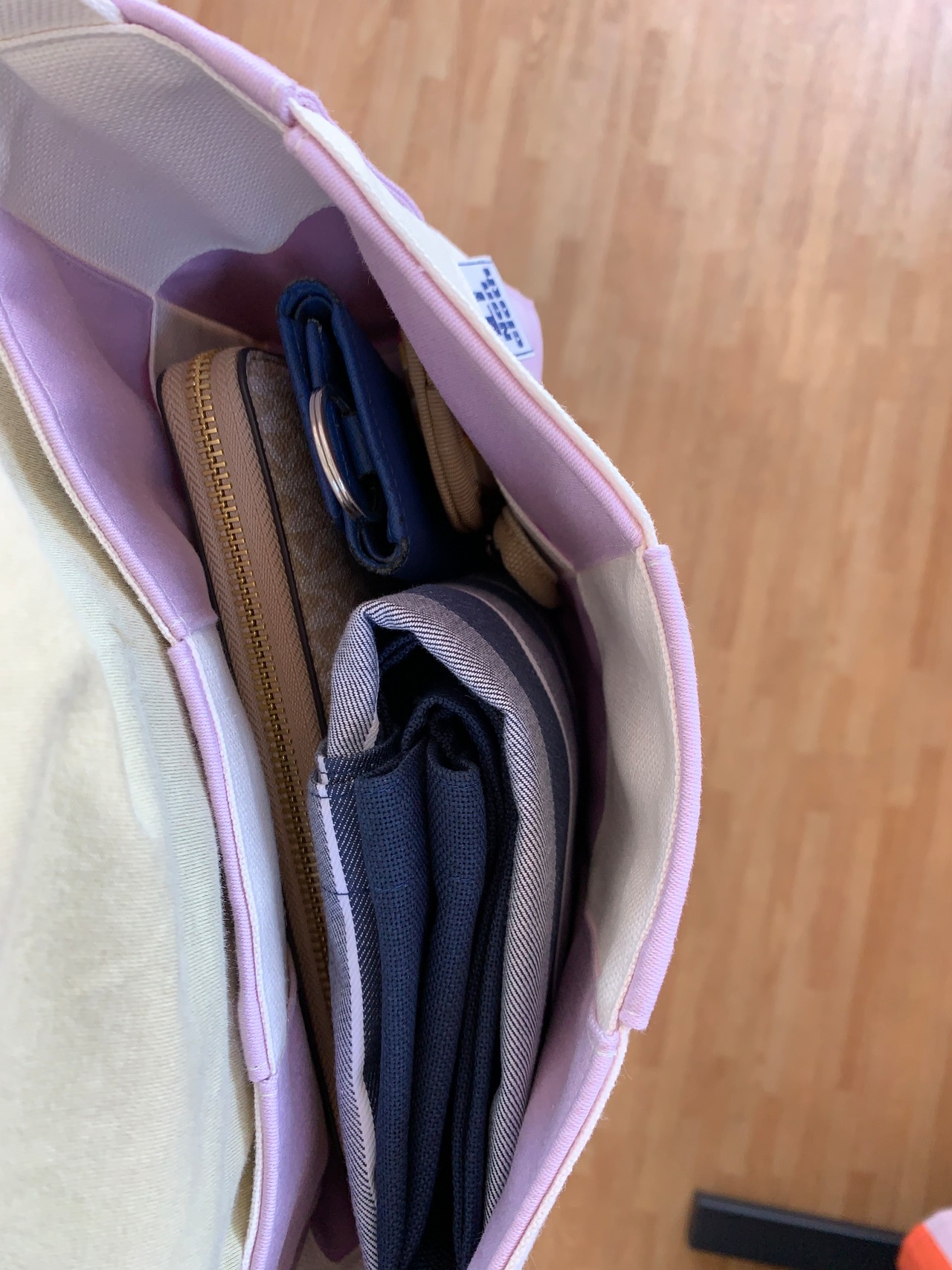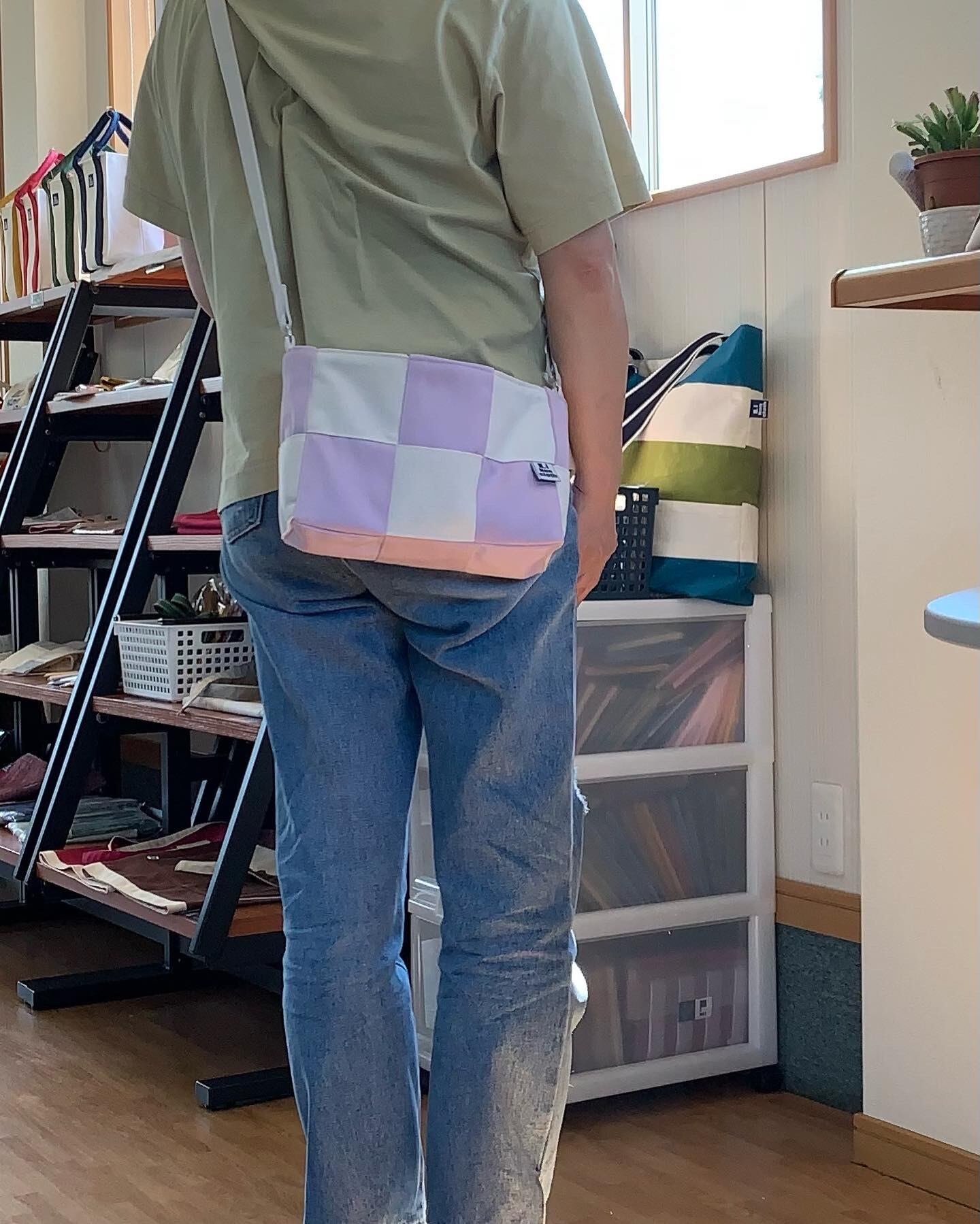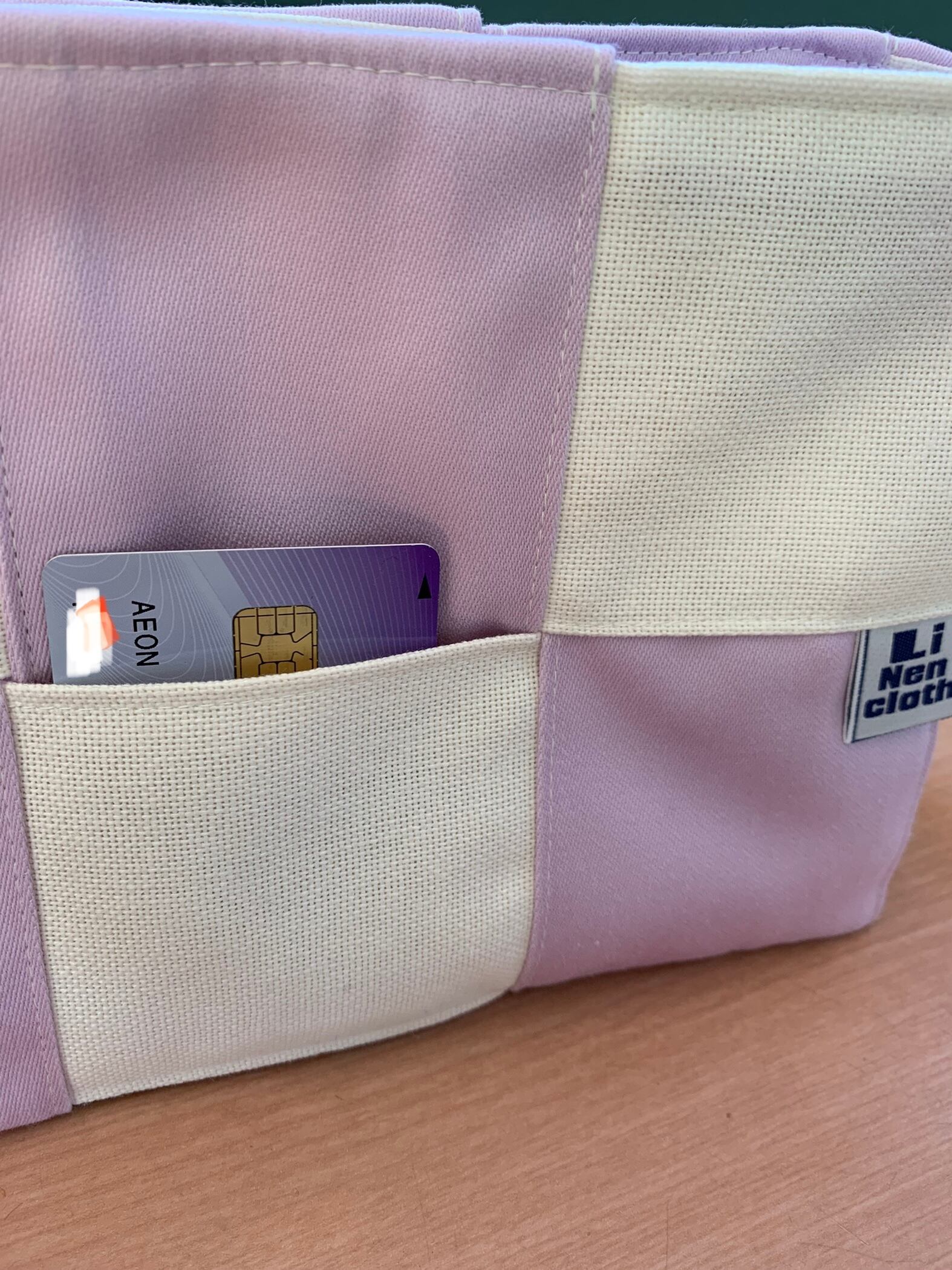 オフホワイト生地とパープルの生地を交差させて作っていますので、隙間がございます。ピアス等小さな物は落ちてしまう可能性がございますので ご注意下さいませ。