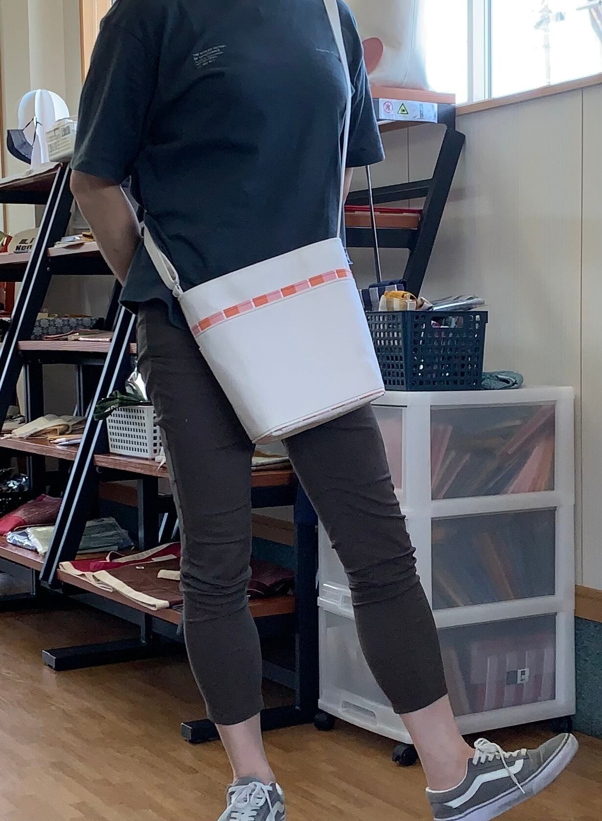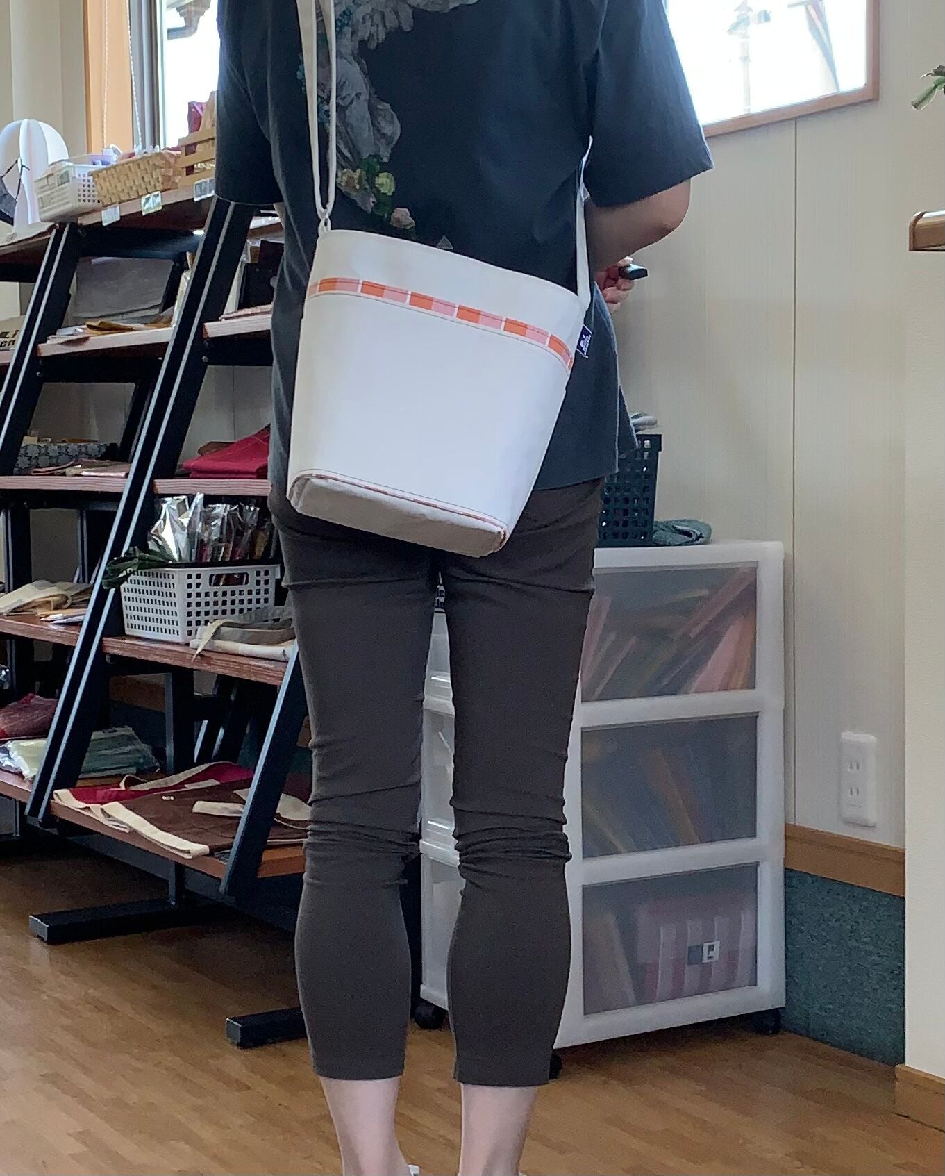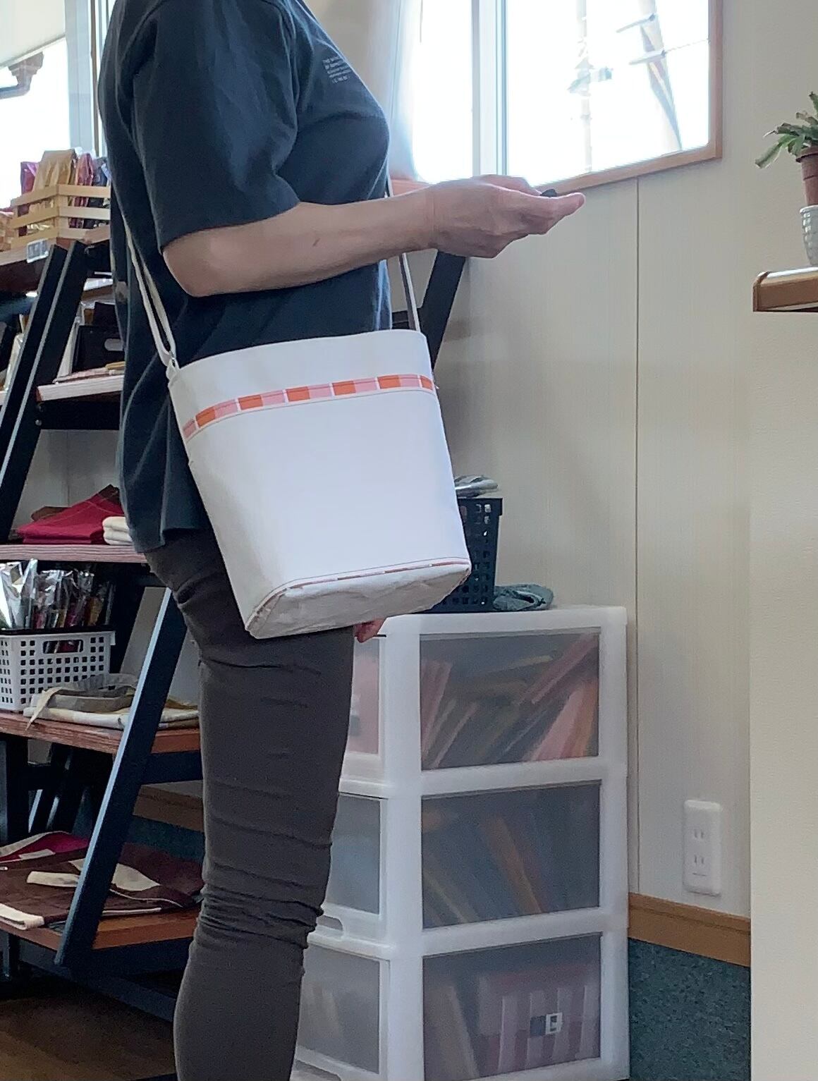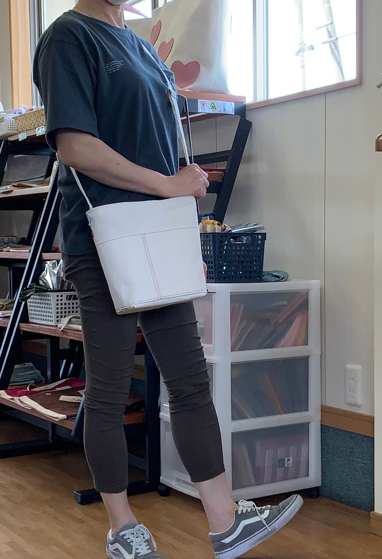表生地とポケットは厚手の接着芯を使用して、しっかりとしたショルダーバッグです。底には、底板が入っているので型崩れしにくいです。